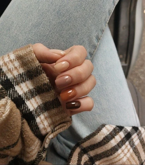 Омбре – это плавный переход от одного оттенка к другому, и в этом сезоне оно особенно популярно в теплых осенних тонах. Переходы от светло-коричневого к темно-шоколадному или добавление золотых и медных переливов придают маникюру глубину и утонченность. Такой дизайн не только привлекателен, но и универсален, подходит как для повседневного, так и для праздничного образа.
