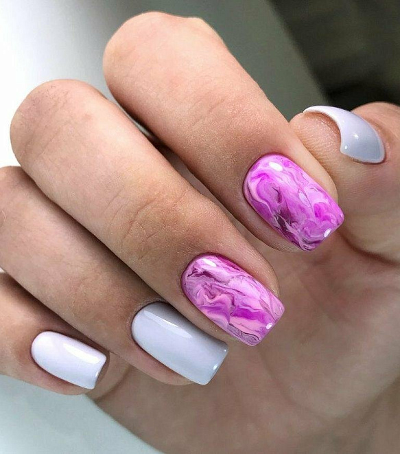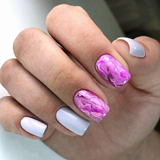 Готовый дизайн завораживает: растекающийся лак образует причудливый узор, завораживает игрой оттенков, плавно переходящих от одного к другому.