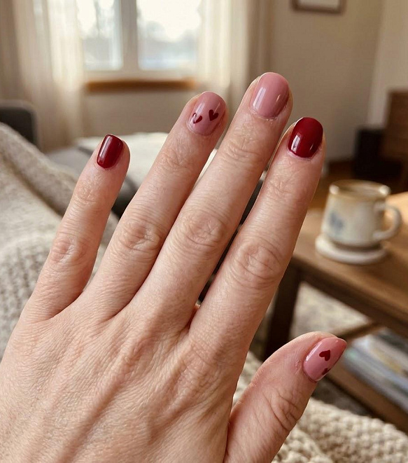 Маникюр ко Дню святого Валентина часто выбирают с сердцами, надписями и нежными оттенками розового или красного. Такой дизайн подчеркивает романтическое настроение.