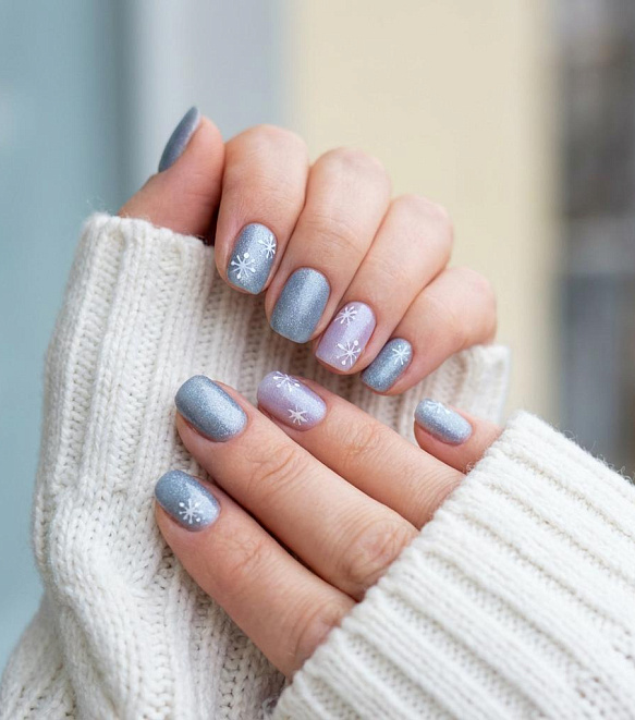 Попробуйте сочетать снежинки с прозрачной или пастельной базой. Хорошо смотрятся и варианты на матовом покрытии, особенно в холодных оттенках.