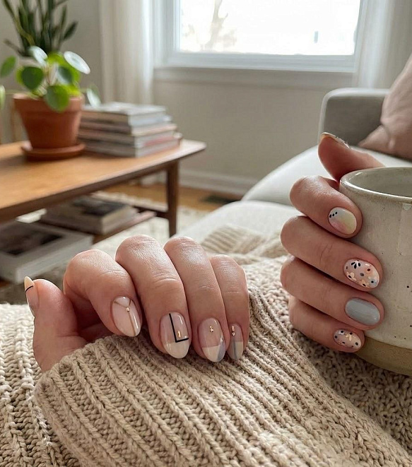 Абстрактные рисунки делают маникюр уникальным. Линии, пятна, геометрия — всё сочетается и выглядит свежо.
